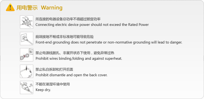 在使用前請(qǐng)檢查所連接的電器設(shè)備的總功率,以確??偣β什怀^(guò)額定功率(2500W),避免因電器設(shè)備的總功率超過(guò)額定功率引發(fā)危險(xiǎn)!